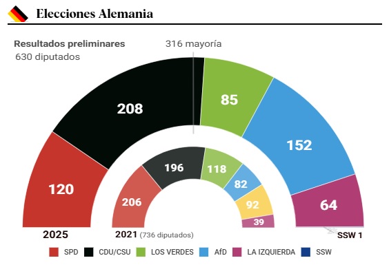 Tras las elecciones celebradas ayer en Alemania, la CDU, liderada por Fiedrich Merz, junto a una estrepitosa derrota del SPD, con Scholz a la cabeza, pero como opción preferida de gobierno entre ambas fuerzas, ya se ha abierto la puerta a una Gran Coalición, dejando fuera a la ultraderechista Alternativa para Alemania, que logró el segundo puesto de los comicios.