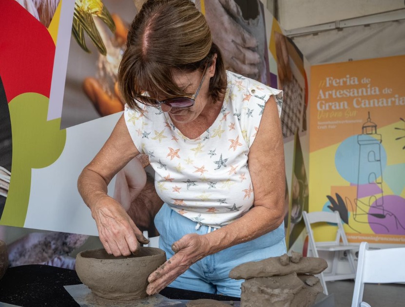 La artesana ha mostrado cómo trabaja el barro convirtiéndolo, ante la atenta mirada de turistas y locales, en piezas tradicionales de la isla como gánigos.