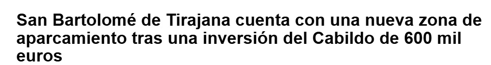 Mientras que el titular de la misma información se deja constancia expresa de que «San Bartolomé de Tirajana cuenta con una nueva zona de aparcamiento tras una inversión del Cabildo de 600.000 euros«. Ya que habría que añadir lo que en la información se cifra como «Además de esta obra, el Cabildo ha llevado a cabo la redacción de proyectos y el suministro de mobiliario urbano en la Zona Comercial Abierta de San Fernando, con una inversión de 60.760,05 euros. Esta actuación se centra en la Avenida de Gáldar, donde se han instalado bolardos, maceteros y un sistema de riego para el ajardinamiento de maceteros y la rotonda de acceso«. Lo que suma un total de 648.760,65 euros.