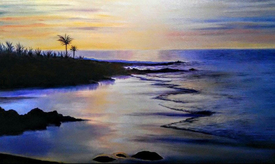 En un lugar tan privilegiado como el Faro de Maspalomas, junto al rumor y la brisa, junto a las aguas de la mar atlántica, dejaba perder la vista en el horizonte de la desbordante imaginación creativa y, de forma paulatina, iba trasladando a los blancos lienzos la sensibilidad plástica que iba recreando con el hilo conductor y argumental de las pinceladas y de la expresividad del cuadro que ya tenía «in mente«.