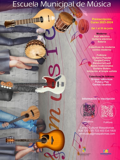 La Escuela Municipal de Música iniciará sus clases oficiales el próximo curso el 1 de octubre, tanto las instrumentales del aula de música moderna como las de su aula de folklore. En la primera, volverá a impartirse formación en bajo eléctrico, guitarra eléctrica y batería, y en la segunda de guitarra popular, timple y contra, bandurria y laúd, bailes tradicionales, guitarra para bolero y de iniciación al timple solista. Las preinscripciones, como de costumbre, se formalizaron al terminar el curso el pasado mes de junio.