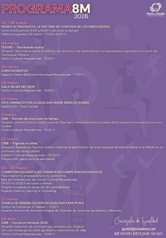 8 de abril: «Cortos en femenino 2026″. Selección de cortometrajes dirigidos por mujeres, con una mirada plural sobre igualdad y experiencias de vida. En el Centro Cultural Maspalomas».