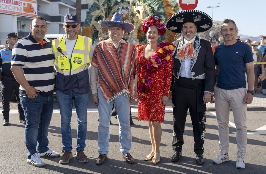 La comitiva contó con la participación de las cortes reales de las cuatro grandes galas de este carnaval: La Reina Adulta, la Gran Dama, La Reina Infantil y el Drag Queen ganador. Además, desde el comienzo, el ritmo lo pusieron las batucadas “Los Piratas del Caribe” y “Paixão”; el color fue cosa de las comparsas Cayó Mambí y Nuevo Estilo; mientras que el humor corrió a cargo de la gente de la calle con sus ingeniosos disfraces, por destacar algunos ejemplos, “el pintor” que se puso a echarle una mano de pintura ficticia a la carretera, el papa que bendecía a los asistentes, la falsa reportera de televisión o el conocidísimo Cantinflas con 40 años de carnavales a sus espaldas, además de los miles de disfraces vinculados a la temática mexicana de este año.