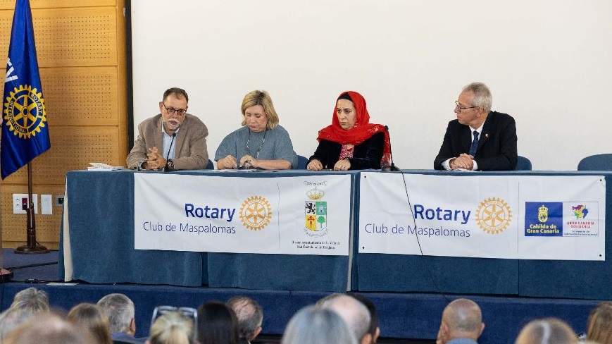 Posteriormente Pedro Ortega Santana, presidente del Club de Rotarios de Maspalomas, pasó revista a la proyección del espíritu rotario, como un reto permanente, en aras a la solidaridad, vocación de servicio humanitario y ese planteamiento de superación permanente que tanto se necesita en la sociedad actual, con la referencia expresa de la denominación «Maspalomas, Ciudad Rotaria por la Paz«. Ninguna otra ciudad en España ostenta este título y sólo otras tres ciudades en toda Europa lo han recibido. «Y lo hace por ser ejemplo de convivencia pacífica, unión entre culturas, solidaridad y trabajo en pro de los derechos humanos«, asegurando por su parte que en medio de la delicada situación internacional actual “este aniversario pone en valor una convivencia real basada en la diversidad, con más de 100 nacionalidades y espacios como el Centro Ecuménico, activo desde los años 70, donde conviven distintas religiones”.