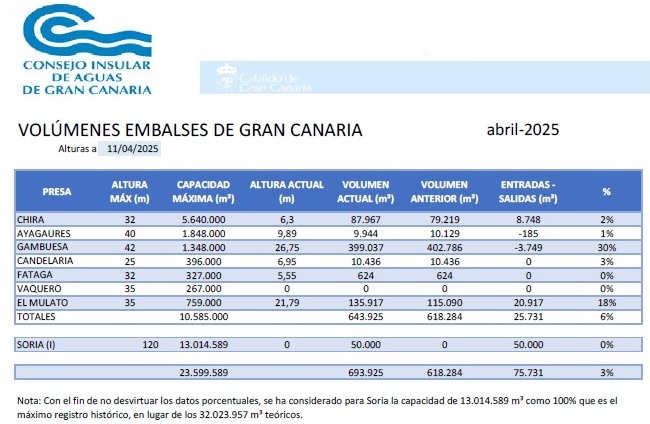 Desde el punto de vista del agua recibida en las presas y balsas del Cabildo en la zona cabe destacar los siguientes datos: Presa de El Mulato: 20.917 m³ (sigue recibiendo pequeñas aportaciones); Balsa del Sequero: 9.000 m³ (recibe sus aportaciones del tomadero del Barranco de El Negro); Presa de Soria: 50.000 m³ y el resto de aportaciones que van llegando se están descargando en el canal del Trasvasur a partir de la toma nº 9. Conviene recordar que el CIAGC está ejecutando las obras de mantenimiento de la presa, por parte de la Comunidad de Aguas La Lumbre, y la toma de fondo está abierta; Presa de Chira: 8.748 m³, no siendo una cantidad significativa (no se ha llegado aún a la toma para poder aprovechar esa agua, faltan unos 5 cm); la Presa de Gambuesa no ha recibido aportaciones, al igual que en el resto de las presas del CIAGC no se han recogido aportaciones.