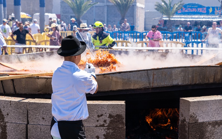 A ellos se sumaron estudiantes del Ciclo Formativo de Grado Medio de Técnico en Cocina y Gastronomía del IES Faro, coordinados por su profesor, Paco Romero, quienes participaron en la elaboración, disfrutando de la experiencia y colaborando estrechamente con los profesionales. En total, tres horas de cocción, esfuerzo y mucha coordinación dieron como resultado una paella compuesta por 350 kilos de arroz, 750 litros de caldo y cientos de kilos de ingredientes como carne, mariscos y verduras.