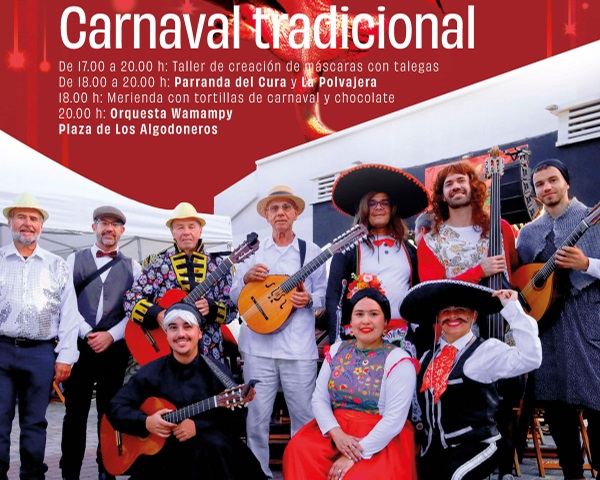 El jueves 12 será el Carnaval Tradicional con talleres de creación de máscaras, merienda de tortillas de carnaval y chocolate y actuaciones de la Parranda del Cura, de La Polvajera y de la Orquesta Wamampy. El viernes 13 será la noche de Drag Transgression. Después la Noche Latina con las actuaciones de Edwin Rivera y Leyenda Joven.