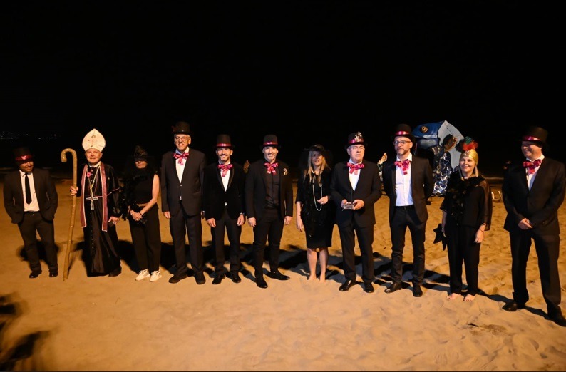 Y con la presencia en el duelo, de buena parte de miembros de la Corporación Municipal de San Bartolomé de Tirajana, como representantes de la más alta institución del municipio, con la presidencia de Marco Aurelio Pérez, alcalde, además de Alejandro Mariscal, primer teniente de alcalde, Yilenia Vega, concejal de Turismo, Festejos y Eventos, Ramón Suárez Ojeda, concejal de Deportes, y otros, de que, ante un entierro de estas características, como supone el de la Sardina Carnavalesca, han presidido el duelo y la despedida de la Sardina, ataviados elegantemente con un traje negro, como se corresponde en los entierros de altos vuelos, señorial sombrero de copa, amplia pajarita de color rosa, junto a la representación eclesial, con el obispo con el báculo pastoral, para entonar el «Adiós, Sardina, adiós«, y el «Sardina, sardina, sardina, sardina te vamos a enterrar» y cuyos restos ya navegan por las aguas de la mar atlántica.