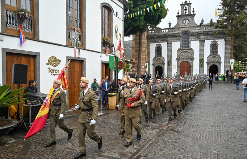 Finalizada la Santa Misa, comenzó el desfile procesional de la Virgen por las calles de Teror, en el que participaron una Escuadra de Gastadores con uniforme de época del Regimiento de Infantería «Canarias» 50 que custodió a la Virgen, la Banda de Guerra N.º 1 de la Brigada “Canarias” XVI y una Sección de Honores del mismo Regimiento.