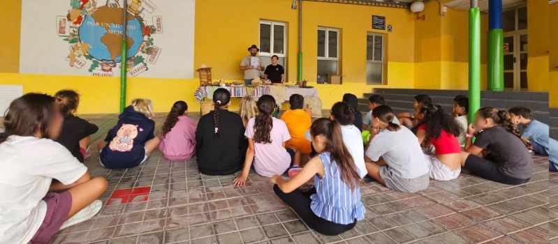 El artesano Raúl León ha contado con la colaboración de la profesora de Danza Folclórica de las Escuelas Artísticas de Mogán, Conchi Romero, para acercar nuevos conocimientos a estudiantes de 4º, 5º y 6º de Primaria y de 1º de ESO, difundiendo aspectos esenciales de la cultura tradicional canaria, sobre oficios antiguos, utensilios domésticos, materiales naturales y expresiones del léxico popular.