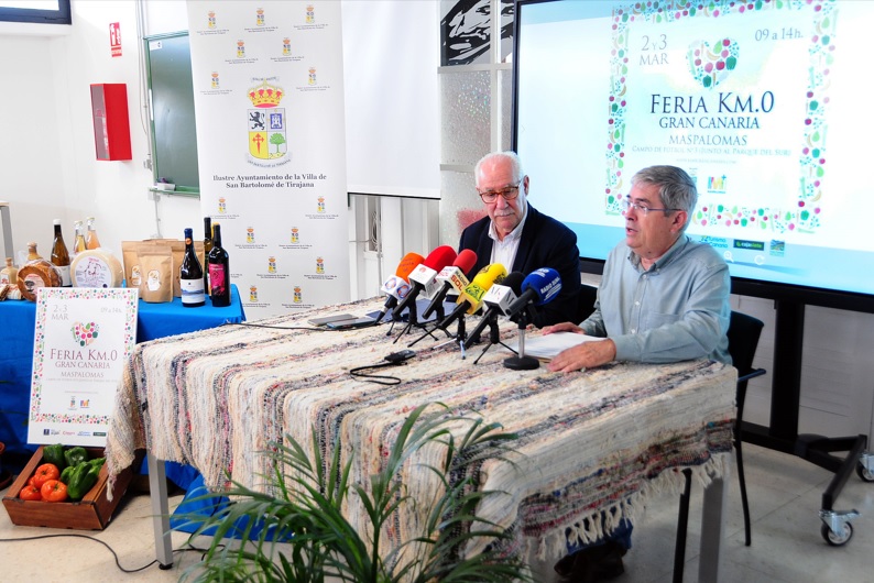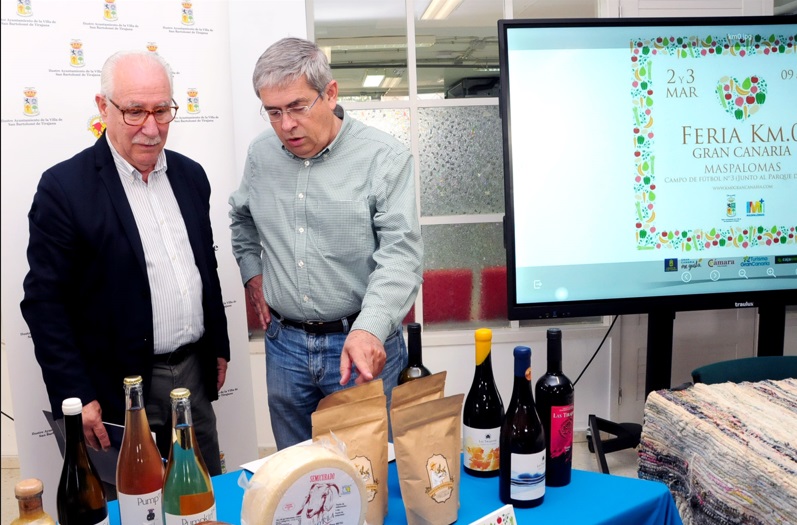 El alcalde de San Bartolomé de Tirajana, Marco Aurelio Pérez Sánchez, y el Consejero del Sector Primario, Soberanía Alimentaria y Aguas del Cabildo de Gran Canaria, Miguel Hidalgo Sánchez,  han presentado la Feria Km.0 Gran Canaria Maspalomas. Es la primera vez que este evento itinerante se celebra en el municipio.