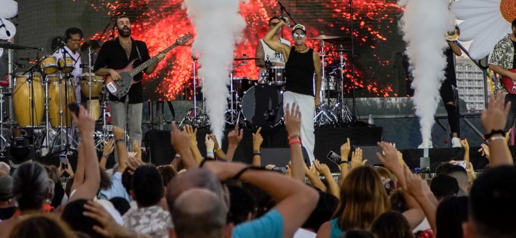 Entre concierto y concierto, el público encontrará un market con propuestas originales: Una atractiva zona gastronómica y un photocall en tonos fucsia y amarillo que invita a compartir la experiencia con el icónico paisaje de las dunas de fondo.
