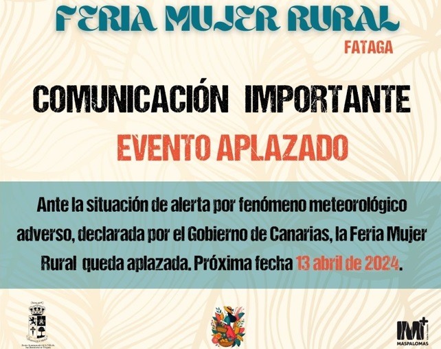 El Ayuntamiento de San Bartolomé de Tirajana ha decidido aplazar la I Feria Mujer Rural que estaba prevista para este sábado en Fataga debido a la situación de alerta por fenómeno meteorológico adverso decretada por el Gobierno de Canarias, y celebrarla el sábado 13 de abril.