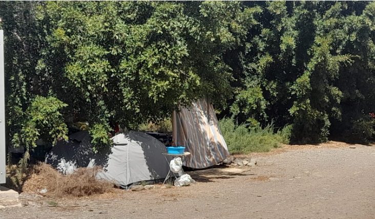 Como lo representan sus cercanías: Un aparcamiento tercermundista, de pedruscos, y donde se realizan, al parecer, algunas visitas sospechosas; un basurero, que ha cambiado de lateral, y que, eso sí, ahora se presenta más ordenado, aunque la basura se acumula desde hace largos día; unas chabolas y tiendas de campaña con sus mesas y sillas en el exterior; un amplio descampado con su aspecto descuidado.