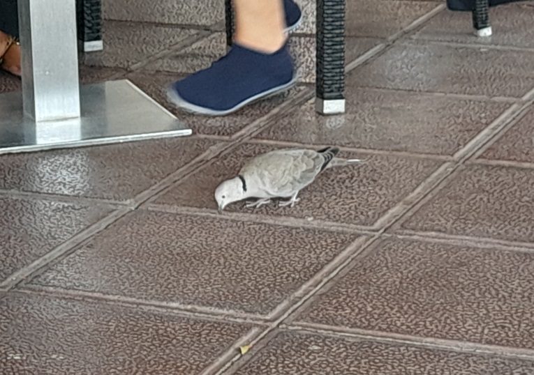 Mientras el Búho mira al tendido, la tórtola picotea por el suelo
