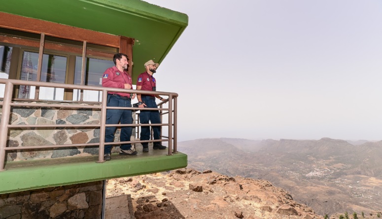 Un todoterreno de la Base 4 transporta a dos agentes forestales del Cabildo hasta una de las torres de vigilancia, en este caso la del Pico de La Gorra, desde la que se divisa casi a vista de cernícalo gran parte de la vertiente sur, envuelta en un velo caluroso y de incipiente calima que difumina el azul del cielo y se eleva como el perfecto telón de fondo de la alerta por incendios forestales que escenifica a su pesar la isla.