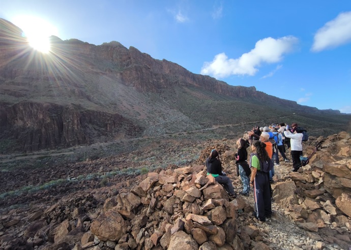 Desde la Necrópolis de Arteara, y rodeados de los restos humanos de la sociedad aborigen que pobló este inmenso barranco, la llegada de la primavera convocó un año más a la ciudadanía para compartir la ancestral observación de su equinoccio. Al frente, los filos del sur de Amurga, desde donde el marcador lanza un haz de luz que, dice la gente del lugar, señala a la tumba del Rey.