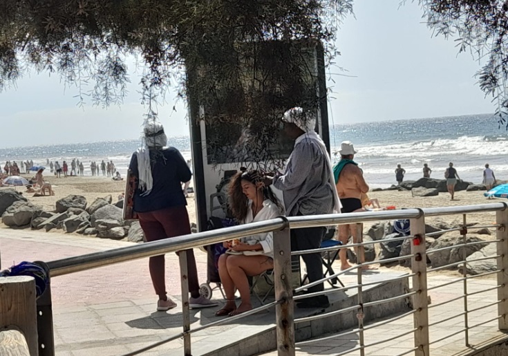 La playa de Maspalomas, uno de los epicentros turísticos, sigue cuajada de inmigrantes con sus mercancías. También de «peinadoras» afro.
